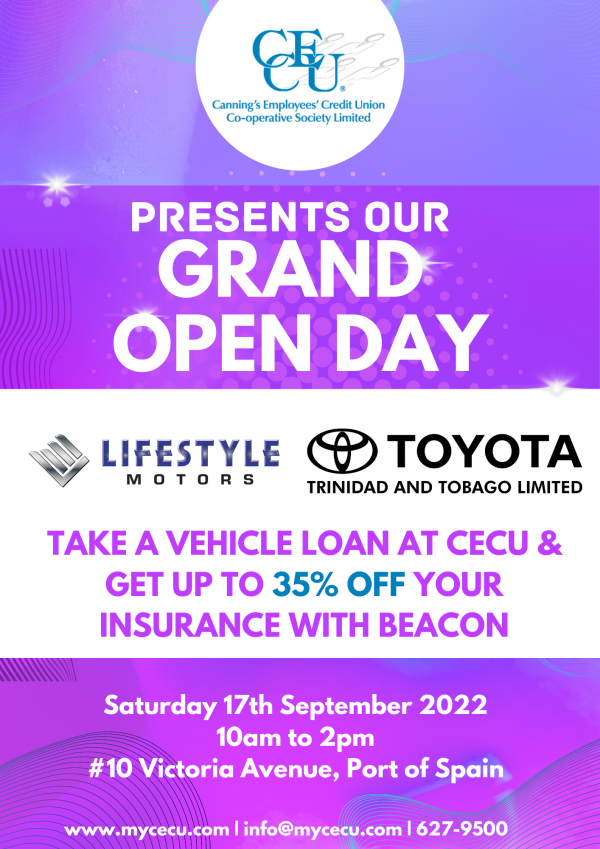 CECU’s Grand Open Day + Add to Google Calendar + iCal / Outlook export Date Sep 17 2022 Expired! Time 10:00 am - 2:00 pm Location Canning's Employees' Credit Union Co-operative Society Limited #10 Victoria Avenue, Port of Spain Share this event